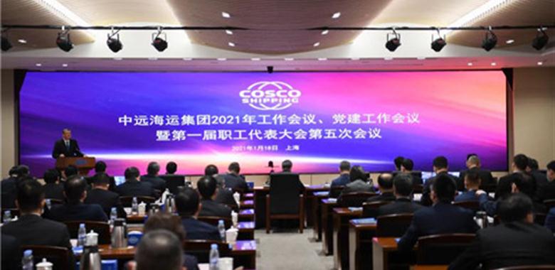 | <!--1月18日,中远海运集团2021年工作会议、党建工作会议暨第一届职工代表大会第五次会议在上海召开。集团董事长、党组书记许立荣在会上讲话。集团董事、总经理、党组副书记付刚峰作总经理工作报告。集团外部董事何庆源、钟瑞明、徐冬根、罗建川,集团董事、党组副书记王海民,集团副总经理、总会计师孙云飞,集团副总经理黄小文,集团纪检监察组组长刘鸿炜,集团副总经理张为出席会议。王海民主持会议。许立荣指出,“十三五”期间集团改革重组发展取得了历史性成就。2020年,集... |