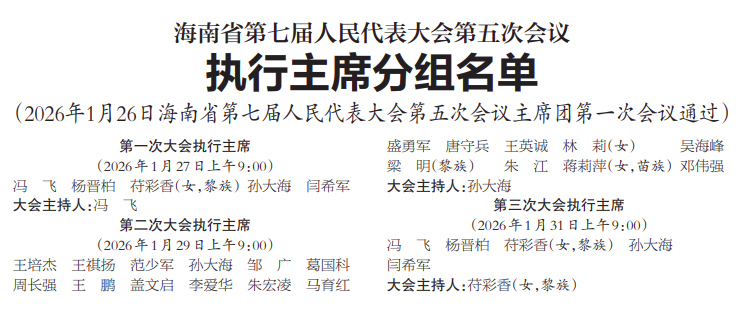 海南省第七届人民代表大会第五次会议将于1月27日至31日在海口举行。大会将于27日上午9时在省人大会堂隆重开幕。
