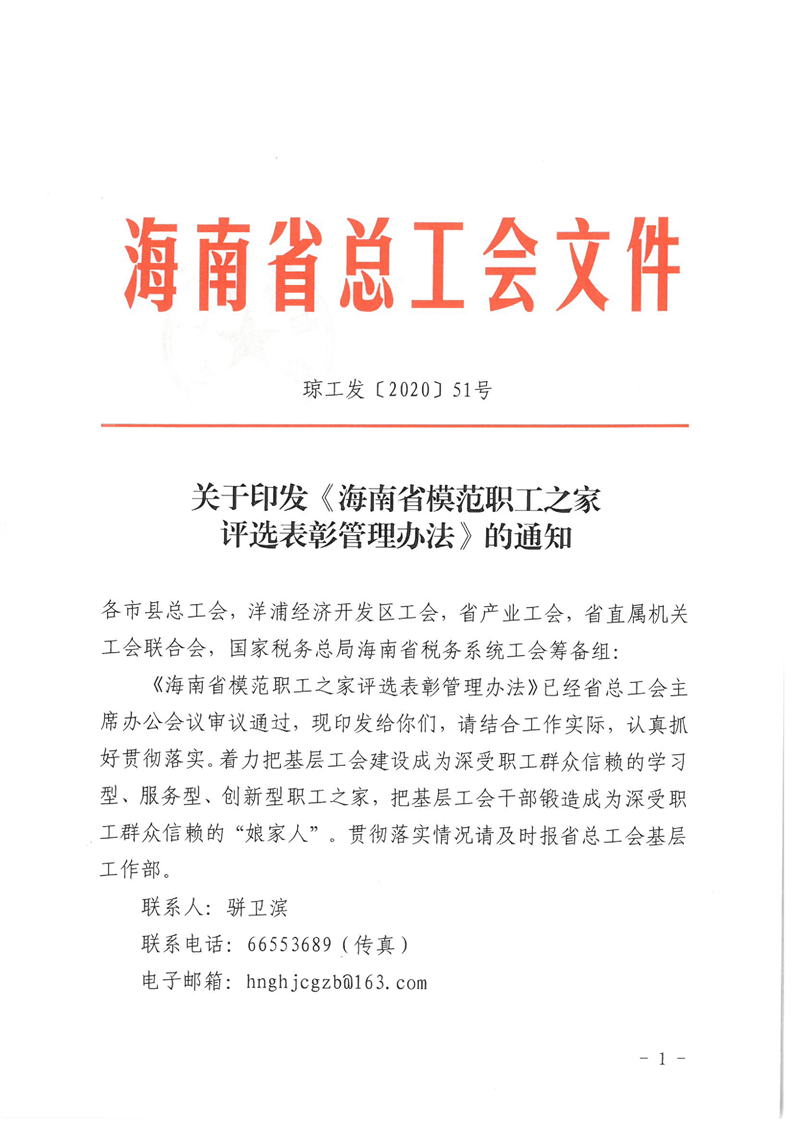 关于印发《海南省模范职工之家评选表彰管理办法》的通知(琼工发〔2020〕51号)